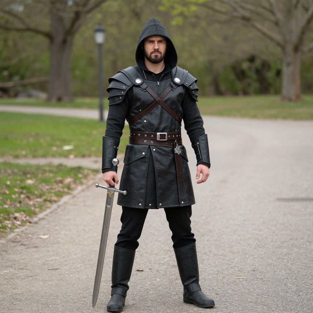 Photograph of a middle-aged bearded man standing in a sunlit, tree-lined path. He wears a long, black hooded cloak with a cross necklace, black gloves, and black pants with a belt. His cloak's texture appears slightly rough, and the hood shadows his face. In the blurred background, several people in dark clothing walk along the path. The sunlight filters through the overhead trees, casting dappled light and shadows on the ground. The man's confident stance and intense gaze add a mysterious, almost ominous aura to the scene.