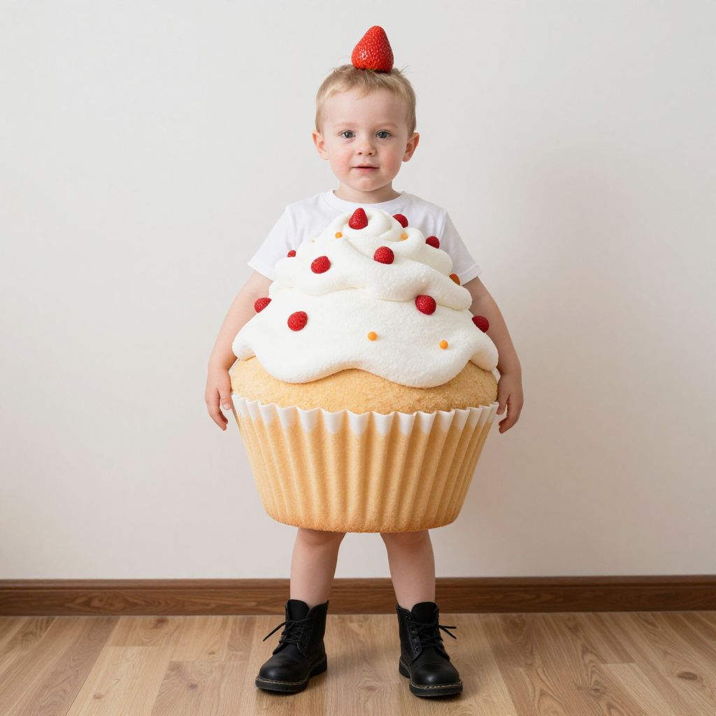 "infant cupcake costume, solo, 1boy, male focus, full body, standing, black footwear, looking at viewer, food, meme, parody, cosplay, what, cake, closed mouth, fruit, strawberry Realistic photo of casual sexy person with pretty face"
