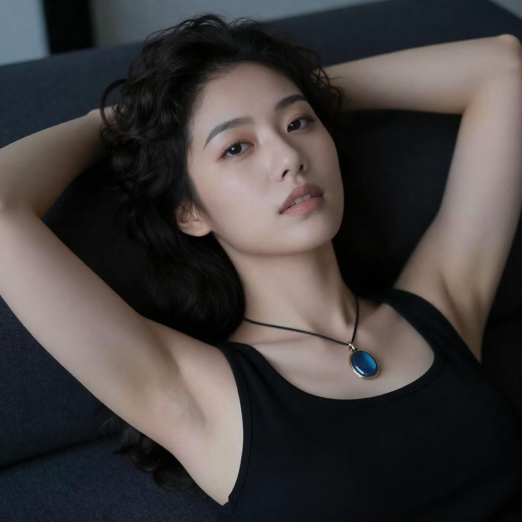Photograph of a young woman with short dark hair lying on a bed, wearing a light blue sleeveless top. She gazes intently at the camera with a serious expression, her arms resting above her head. The background is dark, and the bed has a gray pillow and a light-colored sheet.