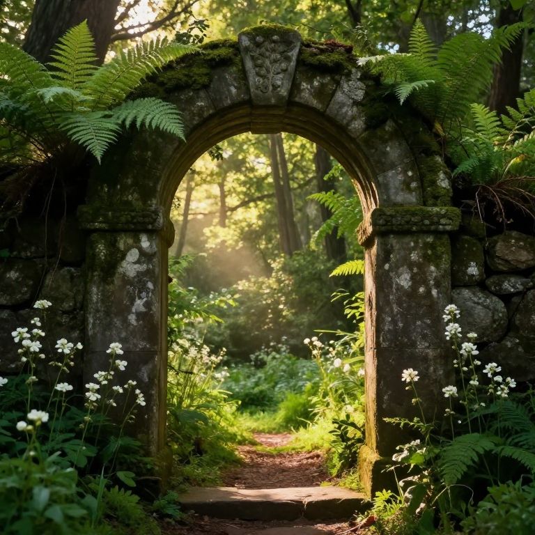 The image depicts an ethereal and beautiful portal under a stone arch, set in a dense, lush forest. The portal, framed by ancient, weathered stone, leads to a vibrant, sunlit clearing. The archway is adorned with delicate ferns and wildflowers, their green and white hues contrasting with the dark, rugged stone. Sunlight filters through the trees, casting a warm, golden glow that illuminates the clearing and creates a serene, almost magical atmosphere. The scene is rich in texture, with the rough, moss-covered stone of the archway juxtaposed against the soft, delicate foliage. The overall composition is balanced, with the portal and its surroundings arranged in a harmonious, symmetrical manner, inviting the viewer to step through the arch and explore the enchanting forest beyond.