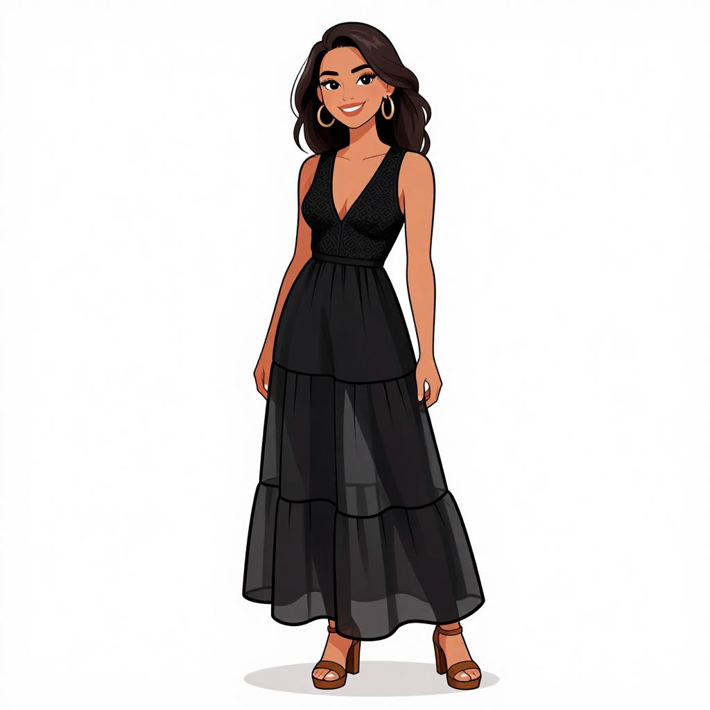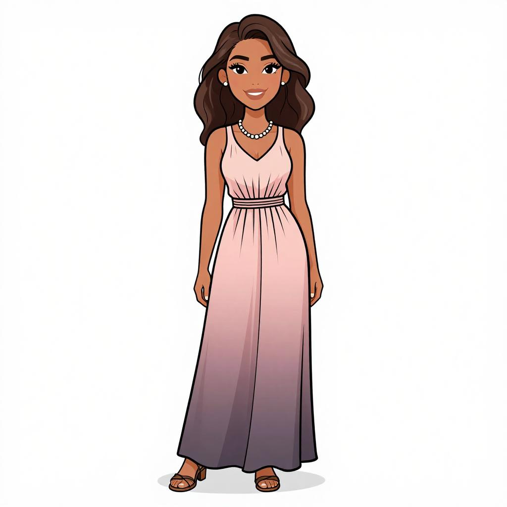 Woman with pretty face and pretty hair. smiling Woman, bohemian chic, sleeveless shift dress in a soft peach hue with subtle floral print, scoop neckline, relaxed fit, above-knee length with slight flare at the hem, delicate gold layered necklaces, thin gold bangle, neutral-toned strappy sandals, studio background with a plain white backdrop. --sref 1467