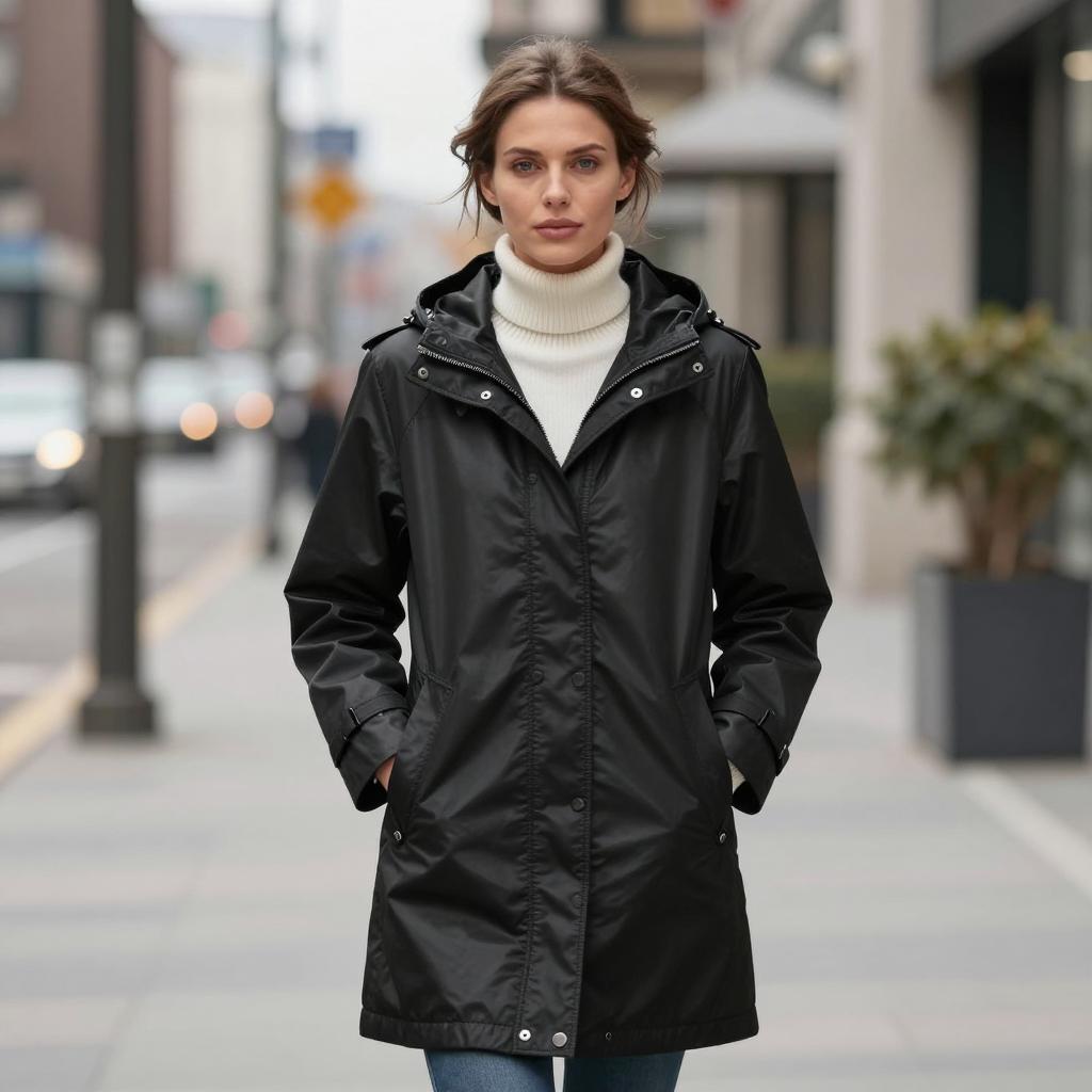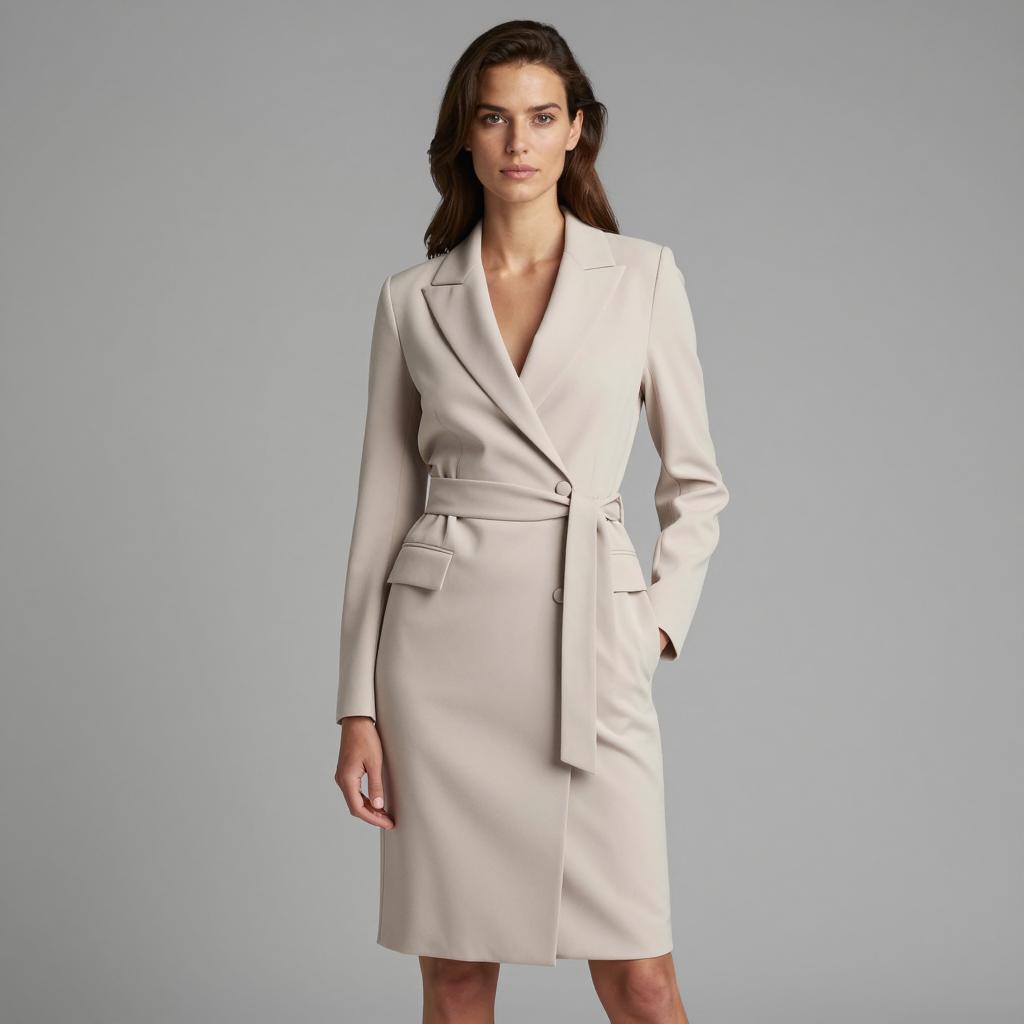 Grey coat costume, photograph of a young woman, standing outdoors, wearing a grey double-breasted coat, long sleeves, belted at the waist, brown buttons, light blue shirt underneath, long wavy brown hair, neutral expression, soft natural light, blurry background with stone columns, urban setting, realistic style, slightly overexposed, shallow depth of field, elegant and modern fashion, daytime, sophisticated atmosphere