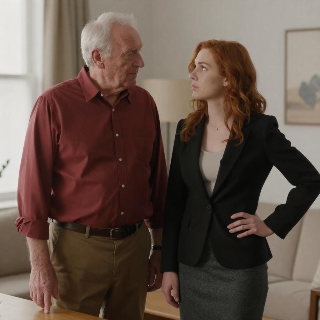 Photograph of an older man with gray hair in a black suit and white shirt, being gently touched on the chin by a woman with dark red hair in an elaborate red dress with sparkling details. They are in a dimly lit, industrial setting with dark, blurred background elements. The woman's expression is gentle and focused.