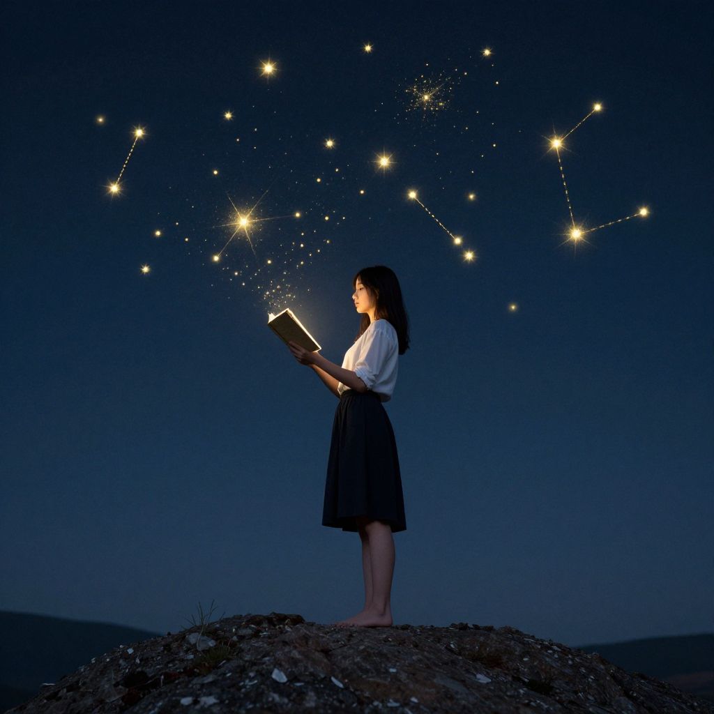 A photograph of an Asian woman with long black hair, standing barefoot on a rocky hill at night. She wears a white blouse and black skirt, holding an open book that emits sparkling stars, which form a constellation in the dark blue sky above. The constellation consists of bright, glowing stars connected by faint lines. The woman is positioned in profile, facing left, with a serene expression. The background is a gradient of deep blue, transitioning to black at the top, with the silhouette of a distant mountain range at the bottom.