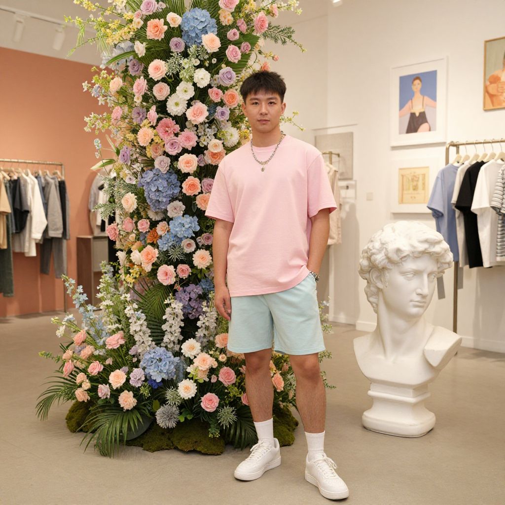 Young Asian man in pink shirt, light blue shorts, white sneakers stands in front of a colorful flower arch and white bust.