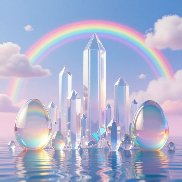 A digital CGI image depicts a cluster of transparent, crystal-like structures resembling skyscrapers, standing on a reflective water surface. Two large, spherical crystals are positioned on the left and right, casting rainbow reflections. A vibrant rainbow arcs across a bright blue sky with fluffy white clouds. The crystals have sharp, geometric edges and facets, and the sunlight highlights their clarity and transparency. The overall scene is ethereal and colorful, blending elements of fantasy and realism.