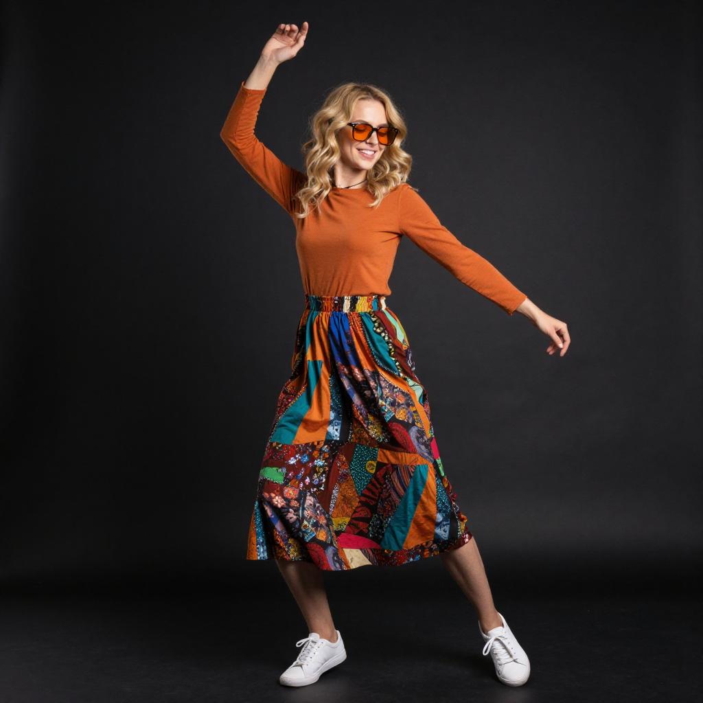 Photograph of a blonde woman with wavy hair, wearing an orange long-sleeve top, colorful patchwork dress, and white sneakers. She is dancing against a black background, with one arm raised and the other bent, smiling with orange-tinted sunglasses.