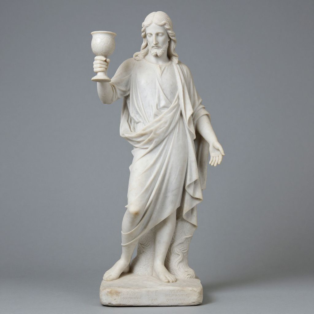 "Neo-Victorian a roman statue of jesus with of a football cup in his hand, 10th century style, white marble, on foot,"