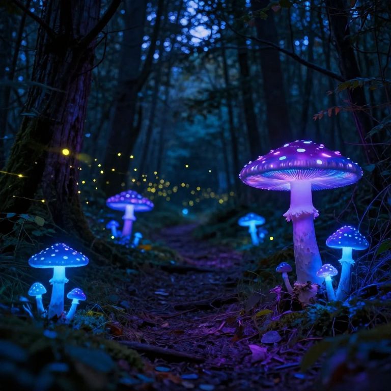 Photograph of a mystical forest path illuminated by glowing blue and purple bioluminescent mushrooms, surrounded by twinkling fireflies, creating a magical,