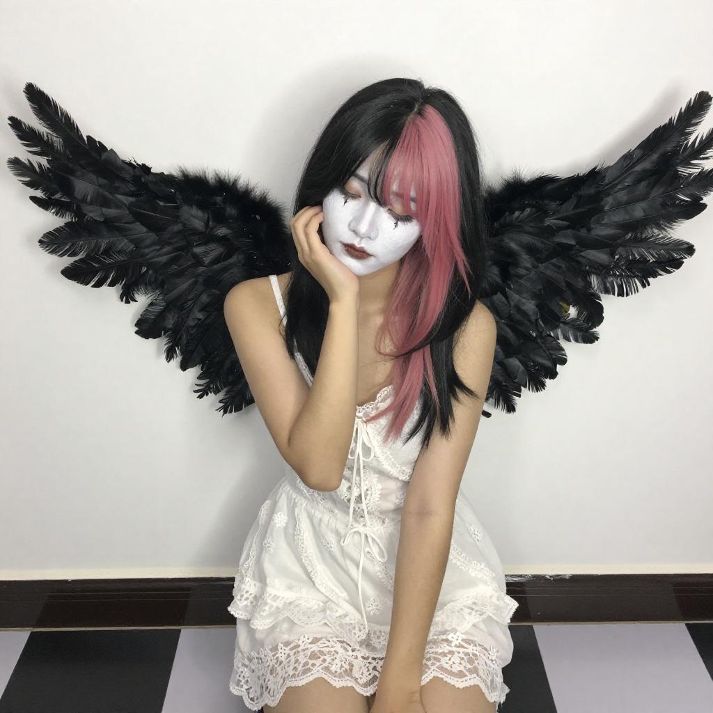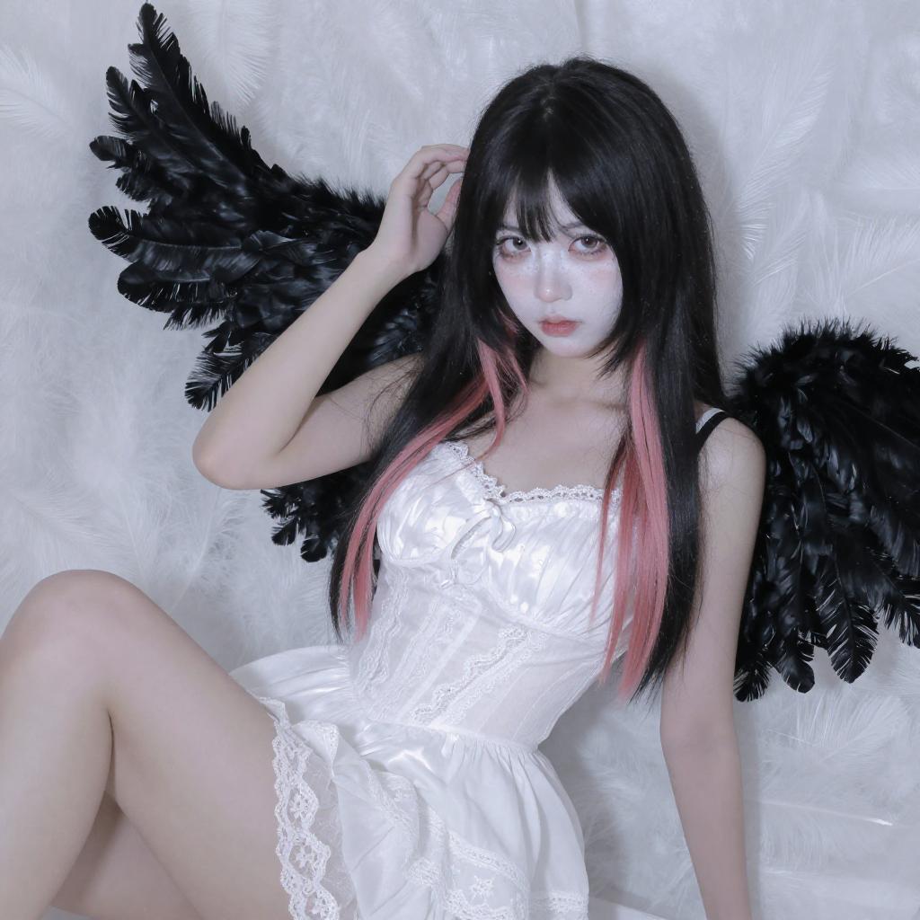Photograph of an Asian woman with black hair and pink highlights, wearing a white angel costume with lace and feather details. She has white face paint with a cross over her right eye, and her hands are raised near her chest. The background is a plain white wall.