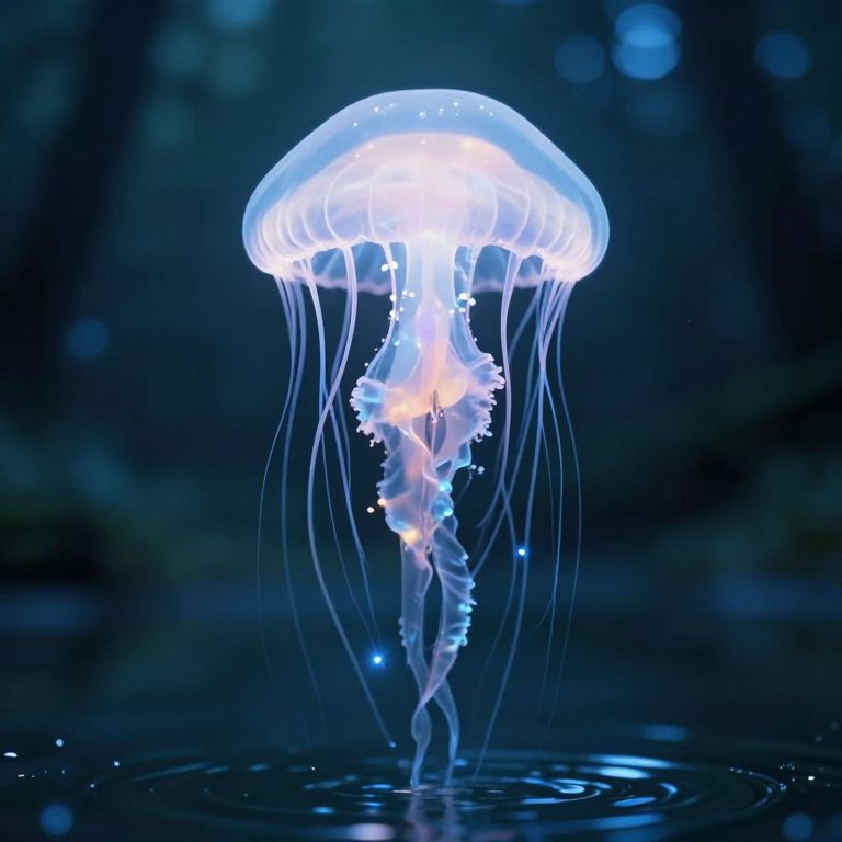 A luminous, otherworldly jellyfish composed of ethereal light hovers serenely over a tranquil forest, its translucent tendrils cascading like moonlit rivers into the still waters below.