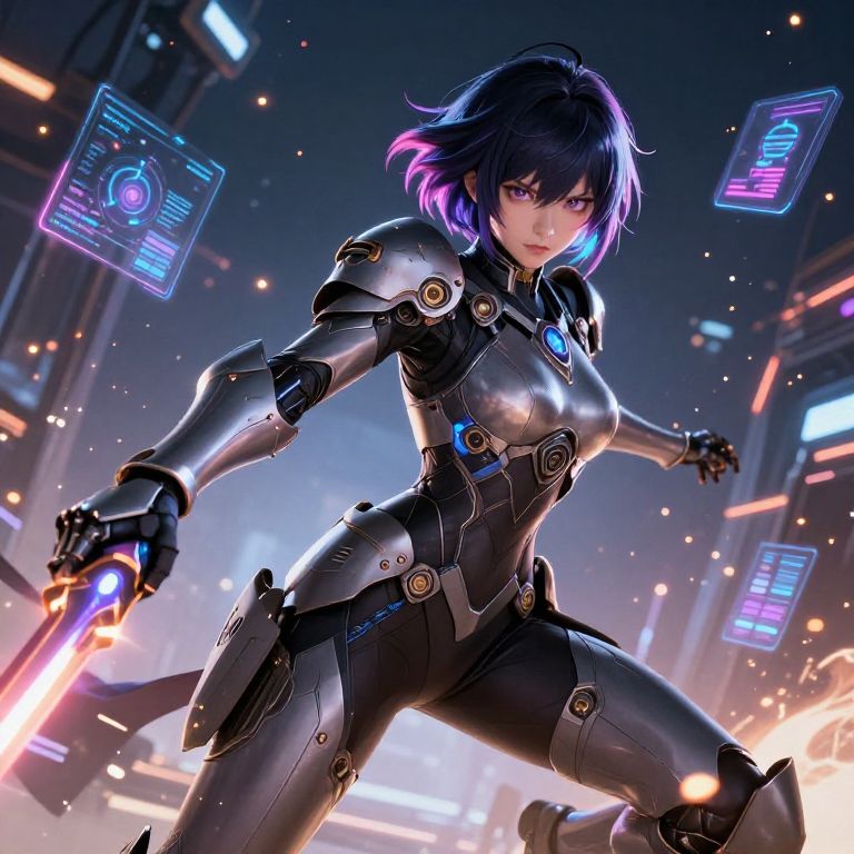 Stable diffusion anime girl as a futuristic warrior with sleek armor and glowing weapons, poised on a high-tech battlefield, intense battle-ready eyes, short spiky hair with neon highlights, dramatic lighting with sparks and holographic interfaces, dynamic action pose, detailed sci-fi anime style