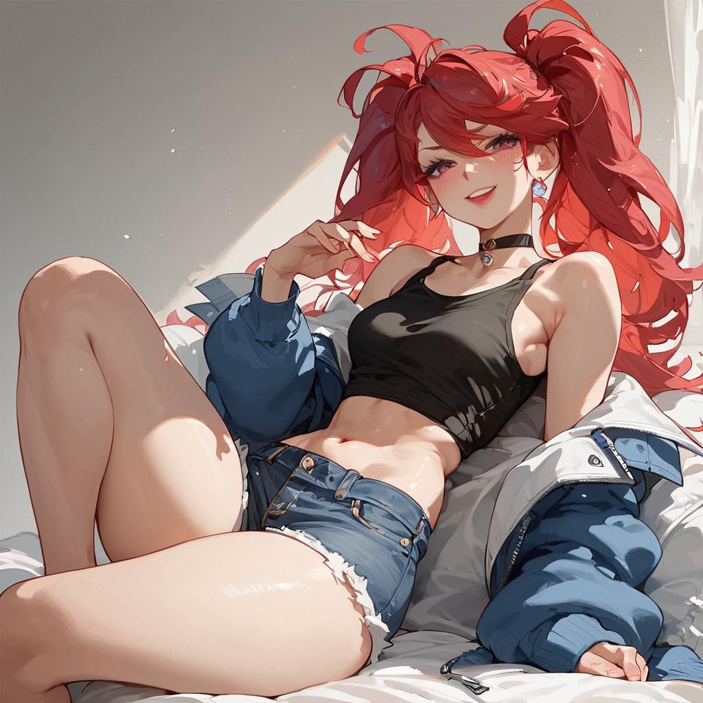 Score_9, score_8_up, score_7_up, , solo, breasts, tentacle hair, purple skin, mottled skin, body freckles, glowing blue eyes, blue sclera, red lips, no nose, red tanktop, red shorts, bronze shoulderpads, white belt, goggles on head, armpits