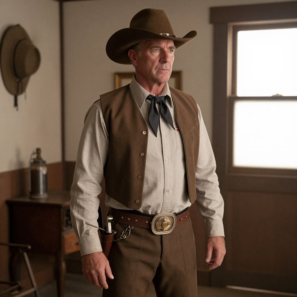 Photograph of a middle-aged white man standing in a dimly lit, rustic room. He wears a brown cowboy hat, white long-sleeve shirt, brown vest with buttons, and brown pants, all accented with a dark blue bow tie. A large silver belt buckle is prominently displayed at his waist. His expression is serious, and he has a slight stubble on his face. The background features a wooden door with sunlight streaming through, a wall-mounted hat, and a small table with a bottle on it. The room has a vintage, western aesthetic.