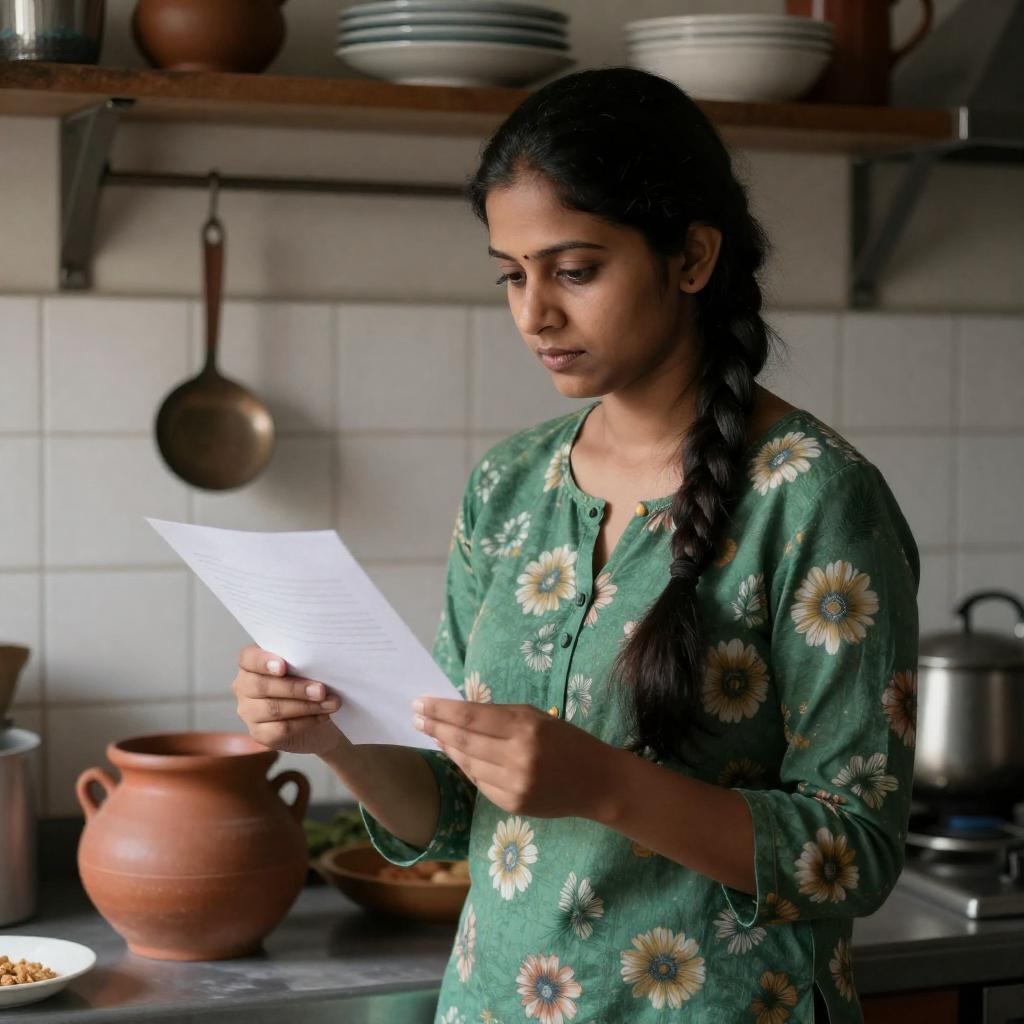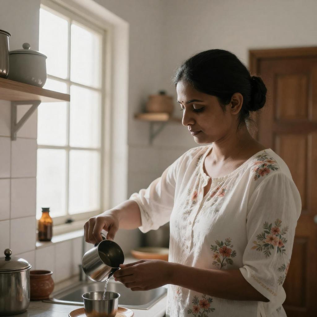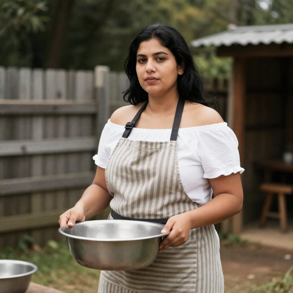 Woman with long black hair, medium breast size, wearing off-shoulder white top, striped apron, holding metal basin. Standing in rustic wooden fence enclosure, forest background. Neutral expression. Daylight. Photorealistic style. Single person. Casual attire. Natural setting.