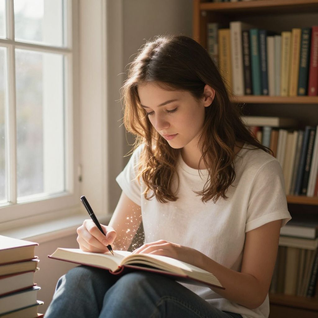 A young woman sits by a window, illuminated by soft golden light, as she writes in an open book surrounded by floating sparkles, with a stack of books and shelves filled with colorful volumes in the background.