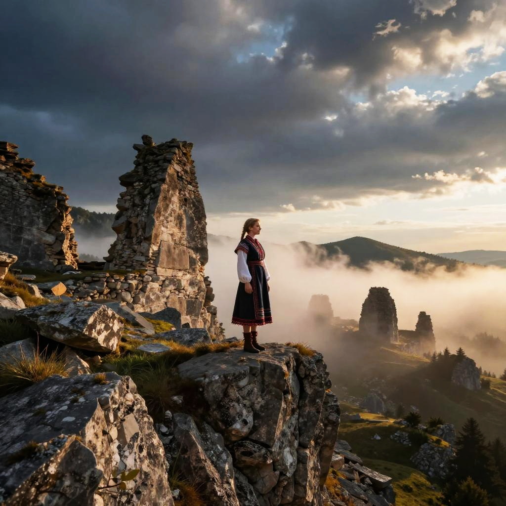 Szela standing on a rugged mountain cliff at dawn, dressed in traditional Eastern European garb, mist swirling around ancient stone ruins, dramatic cloudy sky, vibrant colors highlighting the landscape, cinematic lighting, epic historical fantasy atmosphere