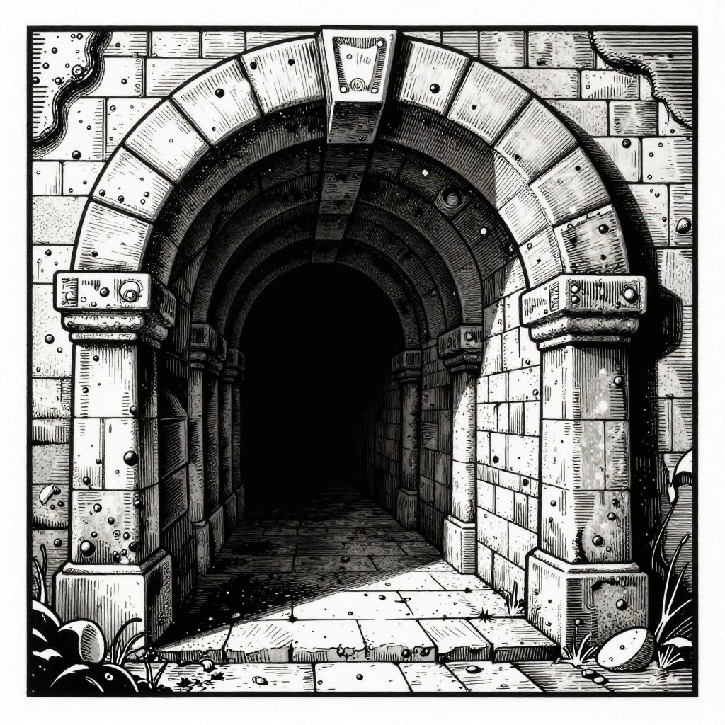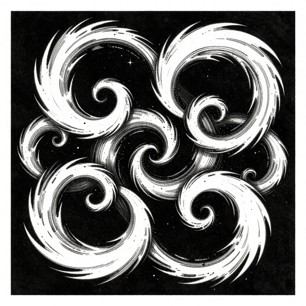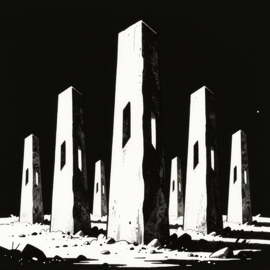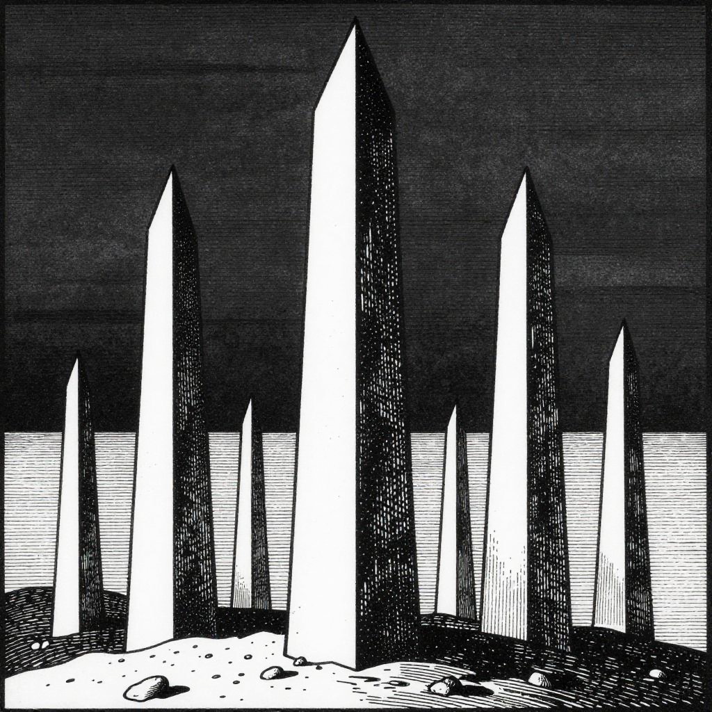 A graphic design illustration of interdimensional abyssal gateways, rendered in black and white in the style of Edward Gorey, Aubrey Beardsley, Lee Brown Coye. Featuring bold, simple, and comprehensible forms, it captures a melancholic, mysterious, and cosmic horror theme.