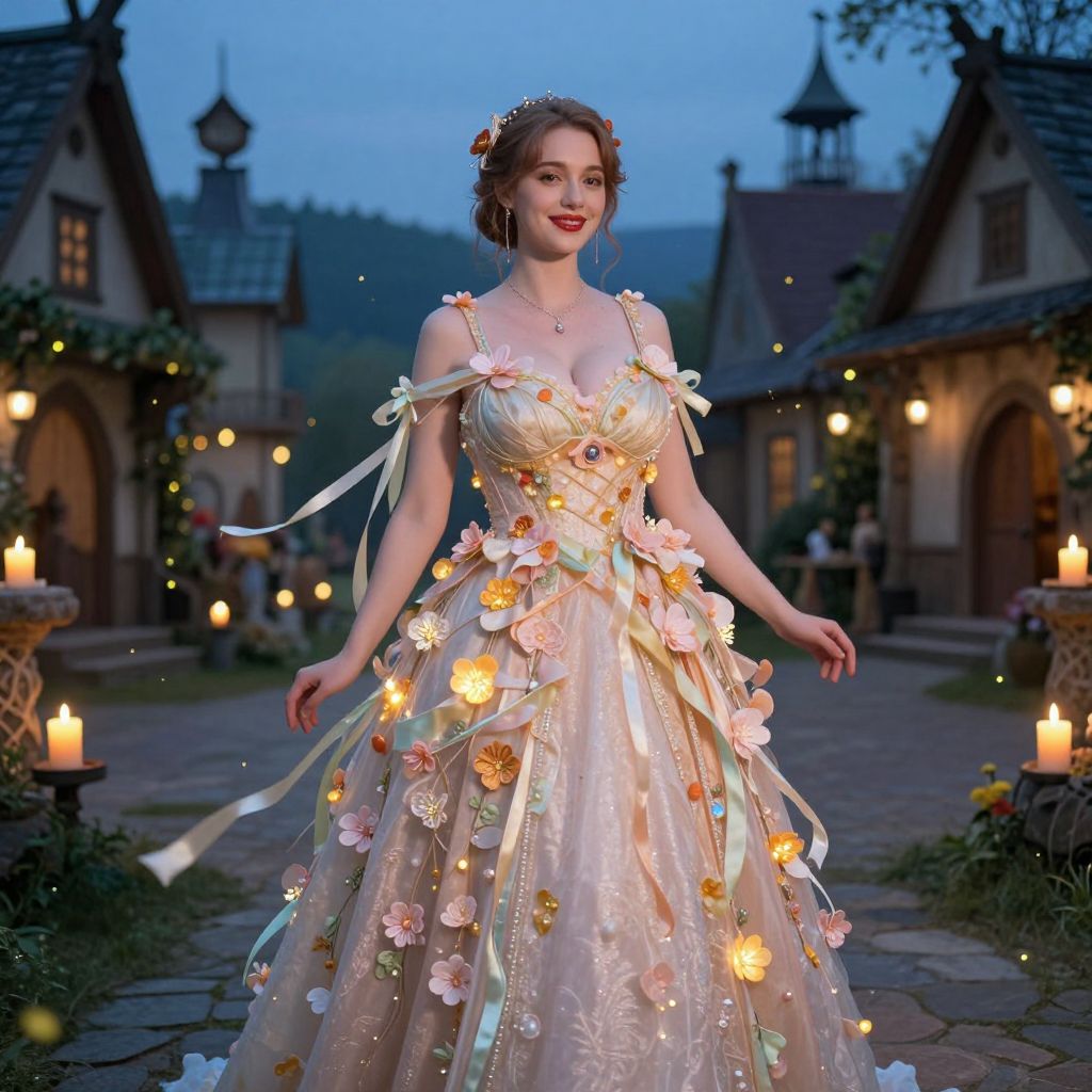 A fantasy enchanted theme party dress featuring floating ribbons and glowing flowers woven into the fabric, worn by an elegant woman with fair skin, red lips, and a warm smile, standing in a mystical village square at twilight, illuminated by fireflies and spell candles, cinematic realism. The woman has big tits and cute face