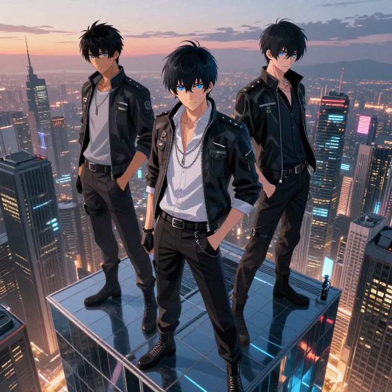 Male anime characters with black hair and blue eyes, posing heroically atop a skyscraper overlooking a sprawling cyberpunk metropolis at dusk, reflective glass textures, detailed modern outfits, dramatic lighting with sunset hues, detailed anime character art.