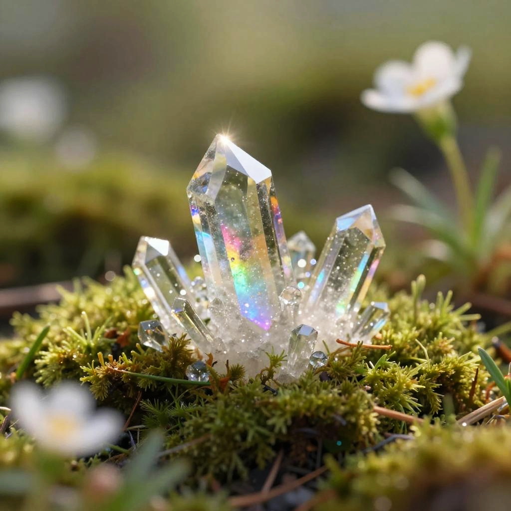 Shiny crystals sparkling under soft sunlight, nestled among lush green moss and delicate wildflowers, with translucent facets reflecting vibrant rainbows, ethereal and magical atmosphere, high detail, fantasy art style.