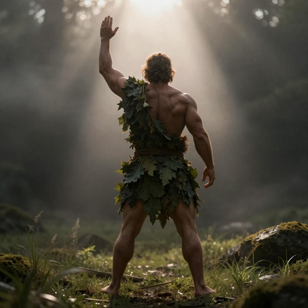 Photograph of a large, muscular man with a raised right arm, wearing a dark, leafy tunic, standing on grassy terrain. Sunlight beams down from the top, creating a dramatic, misty atmosphere. Man's back is to the camera, facing the light.