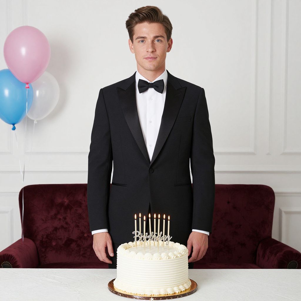 "Birthday Party Dress Man, man in a tuxedo standing in front of a birthday cake"