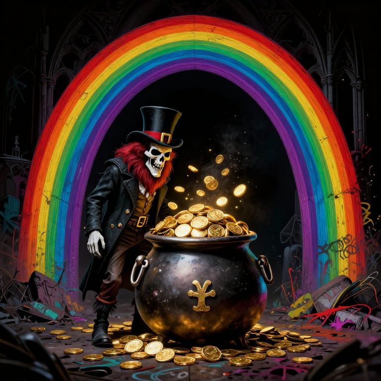 The image presents a striking and detailed illustration featuring a Gothic rainbow arching across the top, leading to a pot of gold at its center. The pot is overflowing with coins, creating a sense of abundance and wealth. To the left of the pot stands a menacing, evil-looking leprechaun character, dressed in a traditional Irish outfit with a top hat and boots, exuding a dark, grimdark vibe. The leprechaun's face is a skull, adding to the eerie atmosphere. The colors are vibrant and bold, with the rainbow's spectrum vividly displayed and the pot's gold coins gleaming. The overall composition is cinematic, with sharp focus and intricate details, reminiscent of Banksy's style. The background is black, emphasizing the colorful elements and creating a stark contrast. The scene is set in a post-apocalyptic, hyper-detailed environment, with graffiti-like textures and a gritty, grim aesthetic. The lighting is dramatic, adding to the cinematic feel and highlighting the central elements of the illustration.