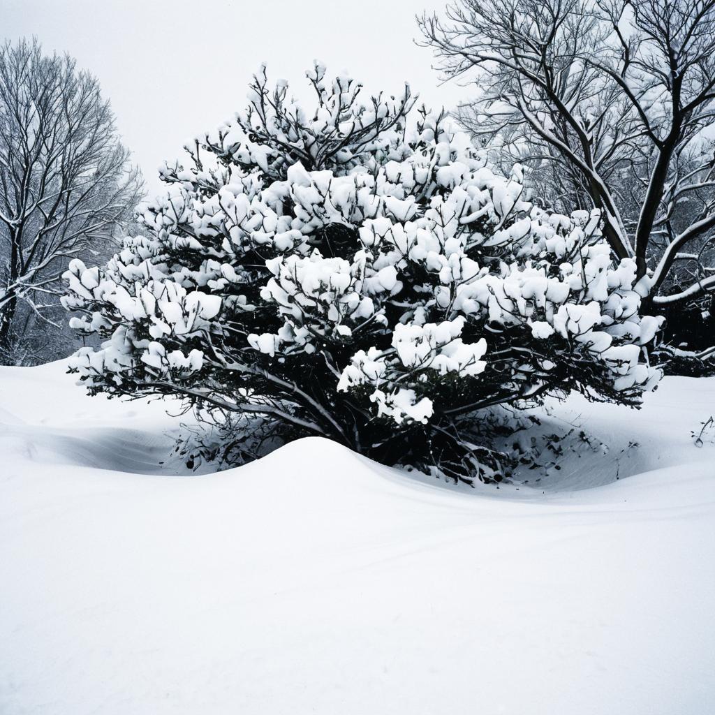 Sorcerer simple diagram of snow-covered shrub covered in snow, burried fully in snow. snow to the top of the shrub. large deep steep void space around the base due to lowest branches blocking snow. emphasis on the deep dangerous void space around the base, void of snow.