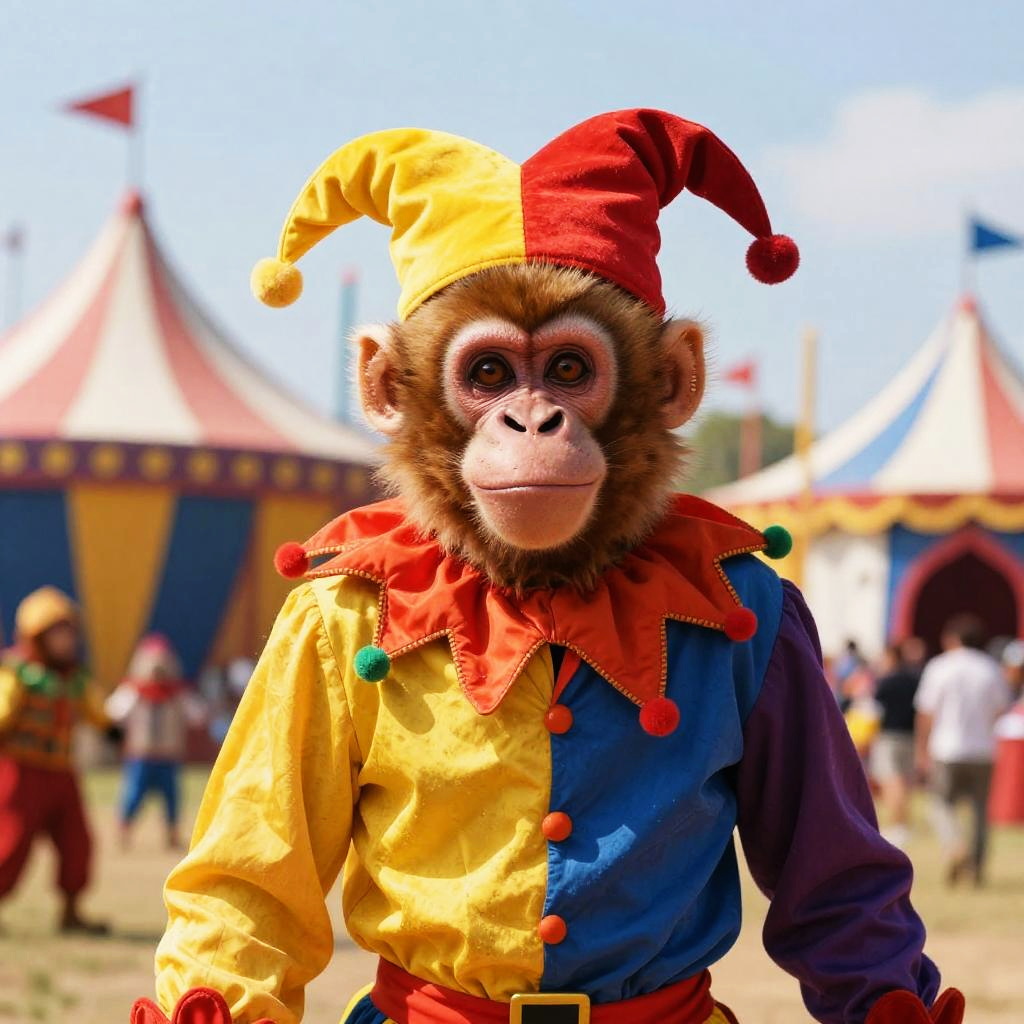 Joker monkey wearing colorful jester outfit, vibrant carnival background, playful and mischievous expression, detailed fur texture, lively circus atmosphere