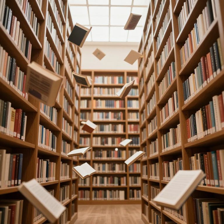 Photograph of a library aisle with floating books between tall wooden shelves filled with colorful books under bright ceiling light.