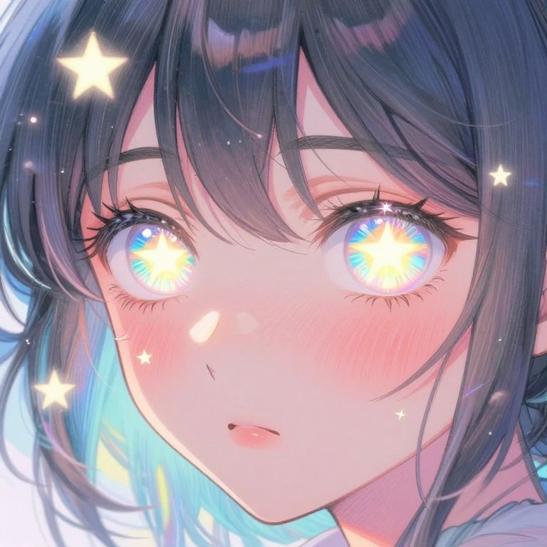 Anime-style, close-up-face, glowing face tattoo of stars, surreal-glowing-eyes, intricate-pupil-design, ethereal-rainbow-reflections, expressive-emotional-stare, soft-pencil-shading, dreamlike-vivid-colors, loose-hair-in-motion, abstract-light-effects, intense-focus-on-eyes, cinematic-composition, lightly-blushed-cheeks, pastel-toned-palette, delicate-linework, melancholic-expression, hyper-detailed-eyelashes, vibrant-color-contrast, artistic-surrealism, immersive-anime-aesthetic