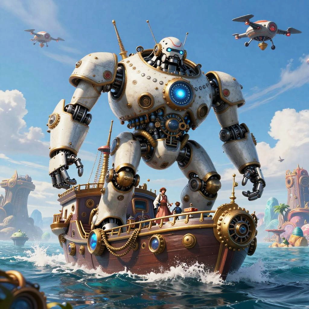 AI One Piece adventure on a giant robotic ship exploring a vibrant alien sea world, combining steampunk and sci-fi aesthetics, pirates with mechanical limbs and glowing eyes, epic sky with flying drones, ultra-realistic rendering