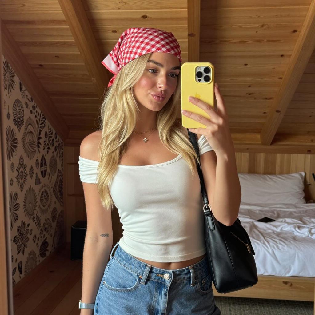 Photograph of a blonde woman with fair skin, wearing a red checkered headscarf, white off-shoulder top, and blue jeans, taking a selfie in a wooden attic room. She holds a yellow iPhone, with a black shoulder bag on her right. The wooden ceiling and patterned wall are in the background.
