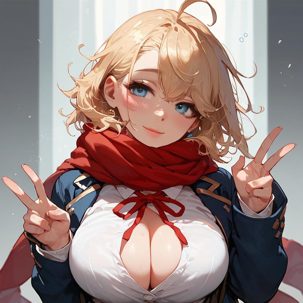 Score_9, score_8_up, score_7_up, source_anime, pinup of cute 1girl, solo, in classroom, sitting on desk, v, grin, blonde hair, twintails, bangs, hair ribbon, red ribbon, ahoge, heterochromia, red eyes, orange eyes, large breasts, school uniform, blazer, white shirt, collared shirt, pink cardigan, open jacket, pleated miniskirt, loose bowtie, choker, zettai ryouiki, brown thighhighs, garter straps