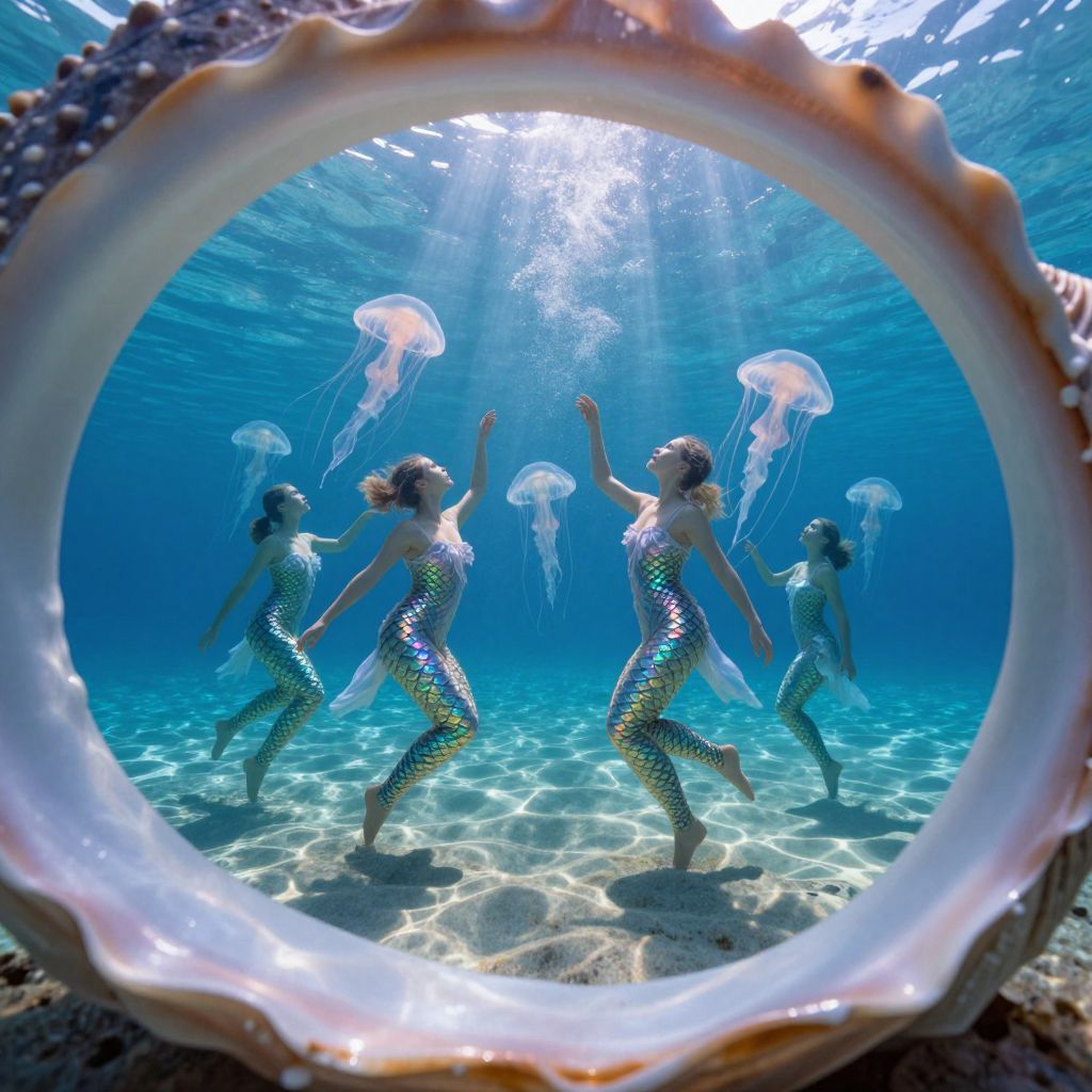 Photograph of five mermaid-like women with fish-scale swimsuits and long hair, dancing underwater surrounded by jellyfish, framed by a seashell