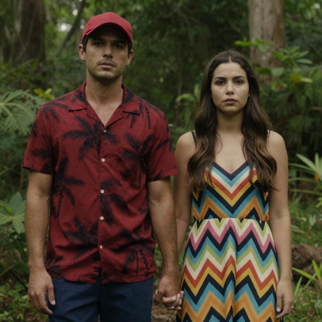Photograph of two people in a lush green forest. Man with short dark hair, red cap, red and black tropical shirt, blue pants. Woman with long brown hair, colorful chevron dress, holding his hand. Both looking forward, serious expressions. Dense green foliage in background.