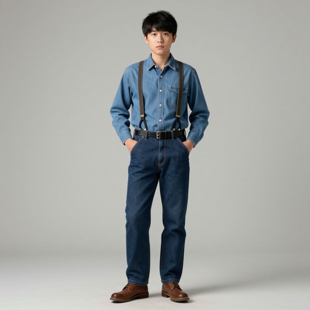 Job costume, 1boy, male focus, solo, black hair, full body, hands in pockets, suspenders, brown footwear, standing, pants, looking at viewer, shirt, belt, simple background, denim, pocket
