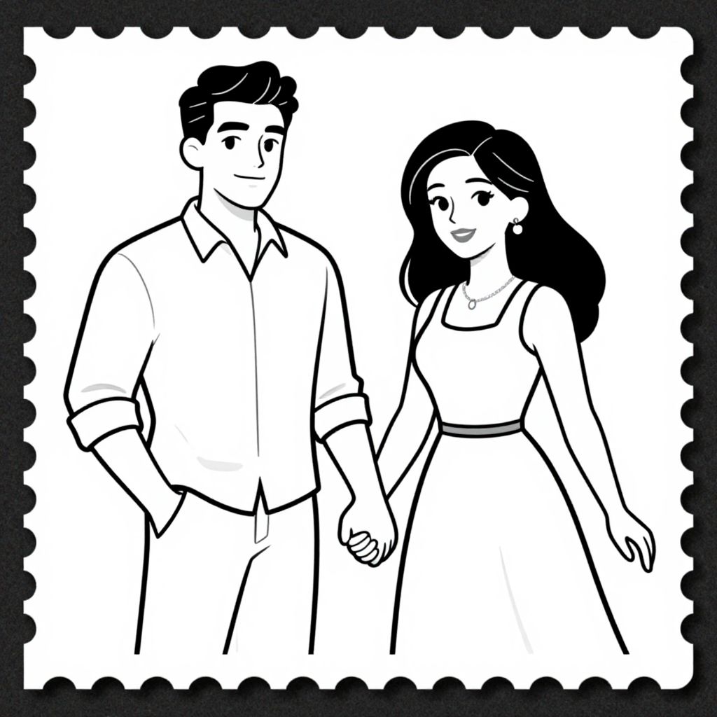 A black and white coloring page features a handsome man and a beautiful woman holding hands, depicted in a cartoon style reminiscent of Valentine's day digital stamps.