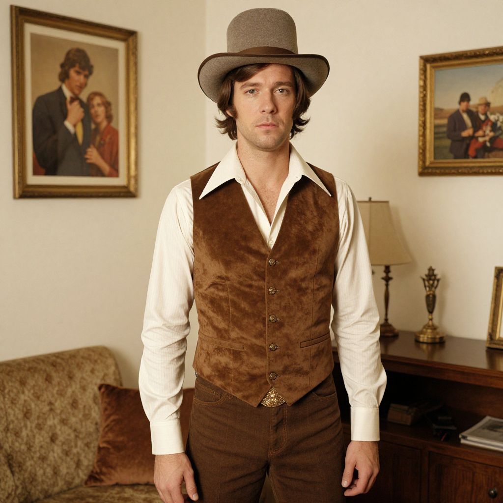 Photograph of a man with medium brown hair, wearing a brown velvet vest, white shirt, and grey bowler hat, standing in a warmly lit
