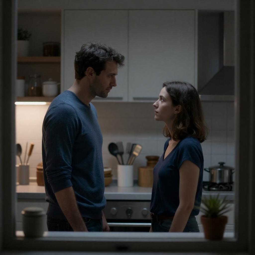 Photograph of a man and woman in a dimly lit, industrial stairwell. The man, with dark hair and beard, wears a black shirt and stands to the left, looking down. The woman, with short dark hair, wears a red dress and stands to the right, looking up. Fluorescent lights cast a blue-gray glow on white tiled walls and exposed pipes.