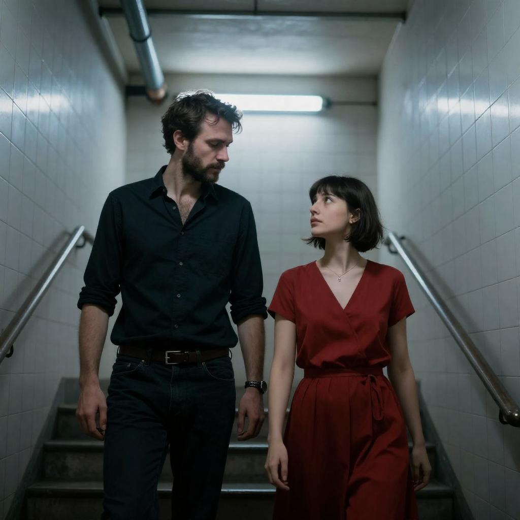 Photograph of a man and woman standing on a stairwell in an industrial setting, dimly lit by fluorescent lights. The man has dark hair and a beard, wearing a black long-sleeve shirt and dark pants, looking downwards. The woman has short dark hair, wearing a red dress with a waist tie, looking up towards the man. The stairwell has white tiled walls, metal handrails, and exposed pipes with a blue-gray light casting shadows.