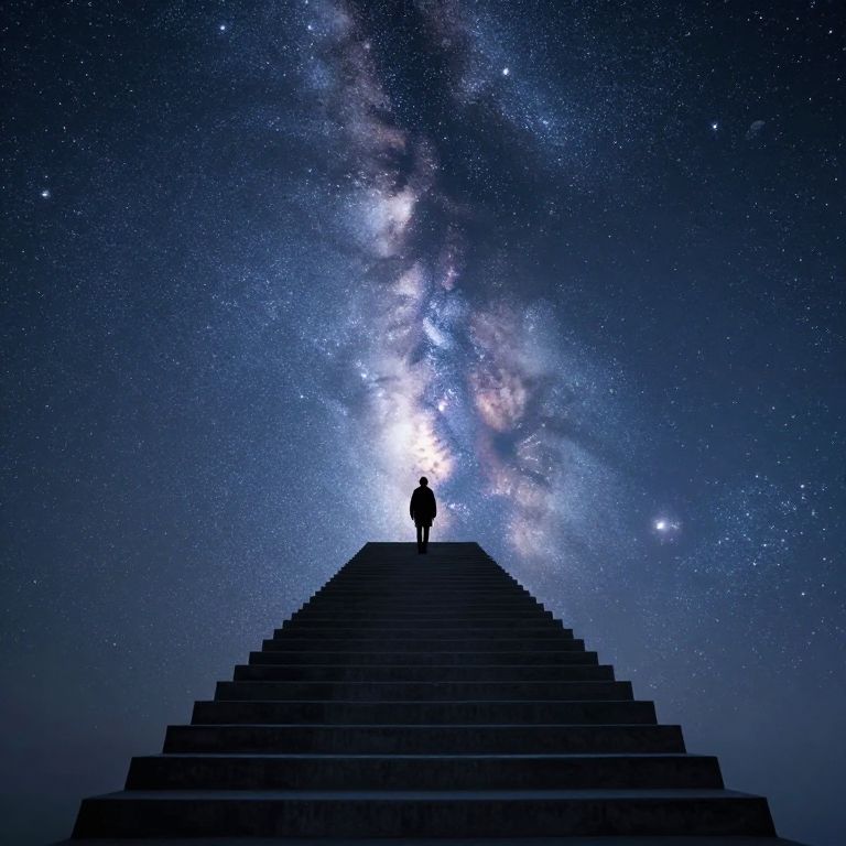 A solitary figure ascends an infinite staircase that vanishes into a starlit cosmos, defying gravity and leading toward the ethereal embrace of the Milky Way.