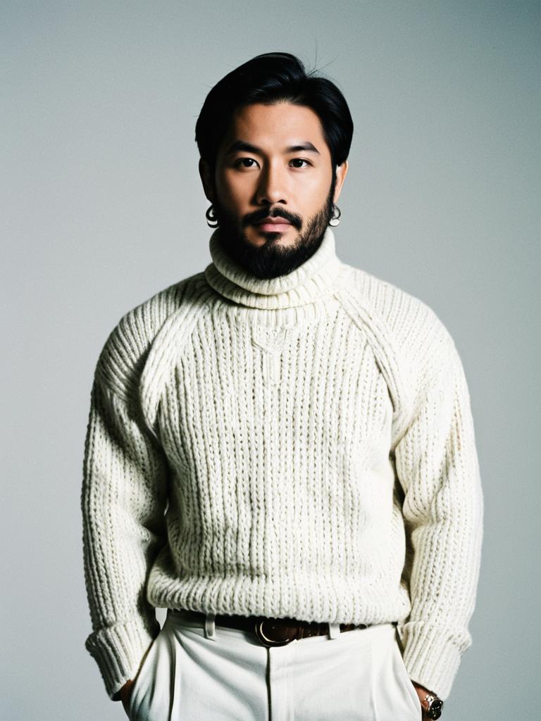 Cable knit sweater costume, 1boy, solo, male focus, sweater, facial hair, beard, jewelry, asian, earrings, realistic, standing, turtleneck, cable knit, white sweater, looking at viewer, black hair, white pants, arms at sides, cowboy shot