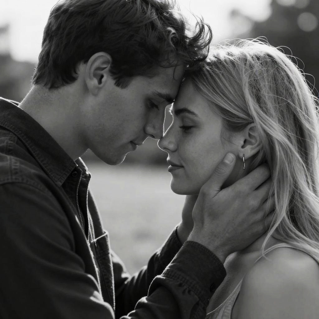 A black-and-white, high-contrast photograph of a couple in a tender moment. The man, with short dark hair, leans in close to the blonde woman, gently holding her face with his right hand. She gazes downward with a soft, serene expression. The image has a grainy texture, and the background is blurred, focusing attention on their intimate connection.