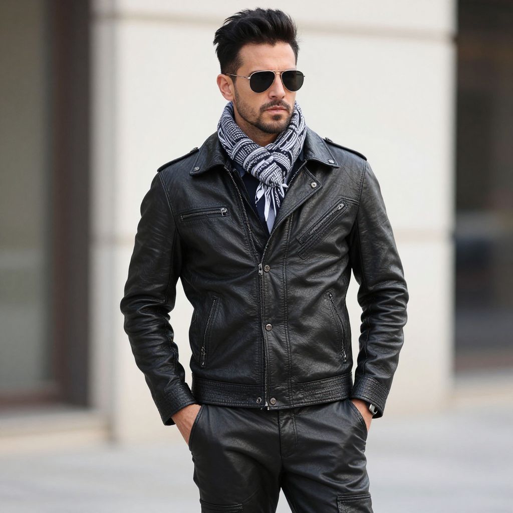 Photograph of a stylish man with dark hair, sunglasses, black leather jacket, striped scarf, and black pants, standing confidently outdoors.