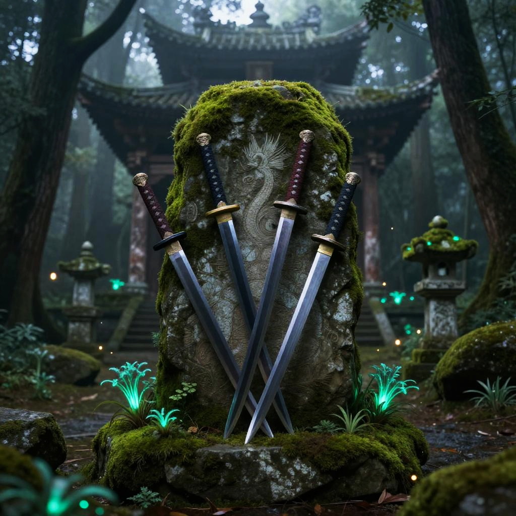 Muramasa and Masamune swords crossed on an ancient stone altar, surrounded by glowing mystical runes and ethereal fog, set in a dark forest with moonlight piercing through the dense canopy, emphasizing the legendary craftsmanship and mythical aura.
