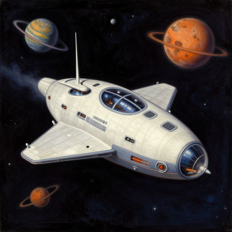 Illustrated space scene: white, retro-futuristic spacecraft with cockpit and wings, flying through dark space with two colorful planets and rings.
