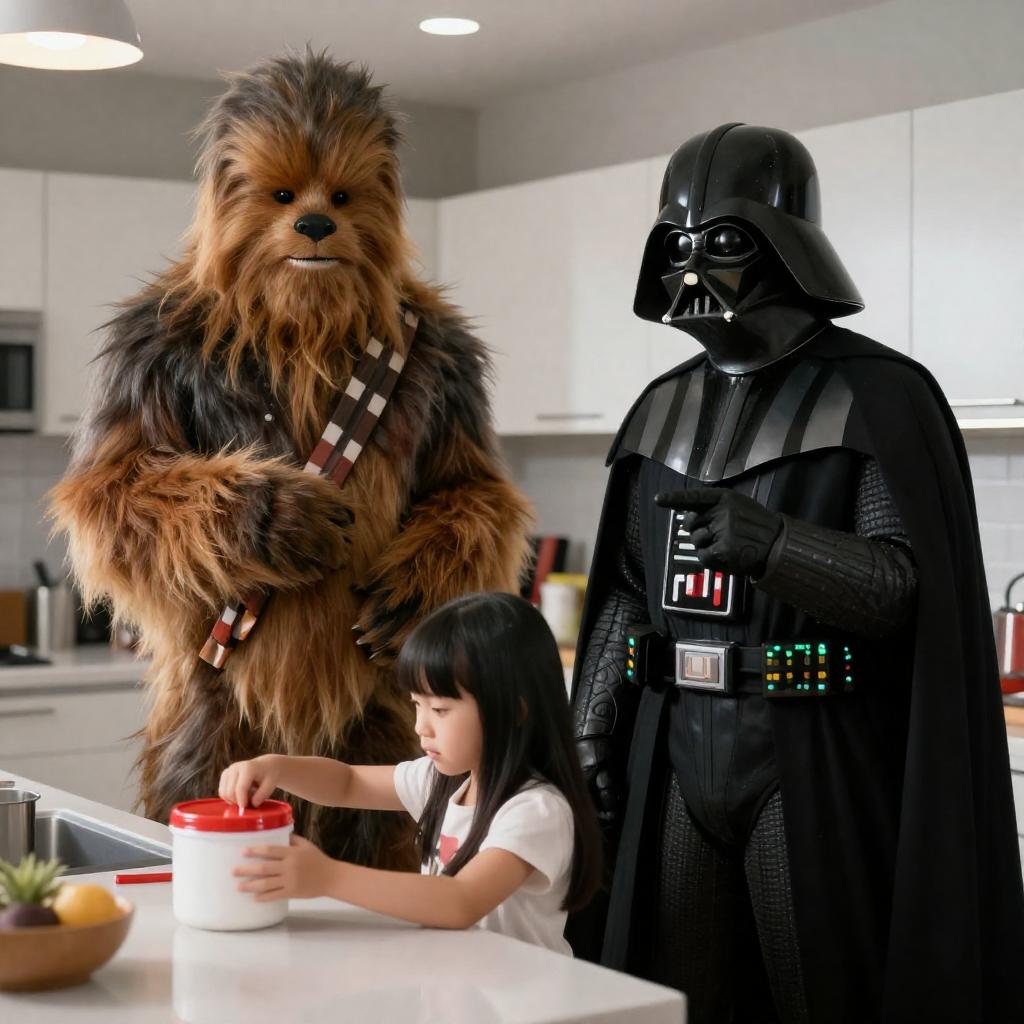 Photograph of a kitchen scene with three Star Wars characters: Chewbacca in brown fur on the left, a masked Darth Vader in black on the right, and a young girl with long black hair in the center. Darth Vader and Chewbacca point at the girl, who reaches towards a red-lidded container on the counter. Bright kitchen lights and various kitchen items are in the background.