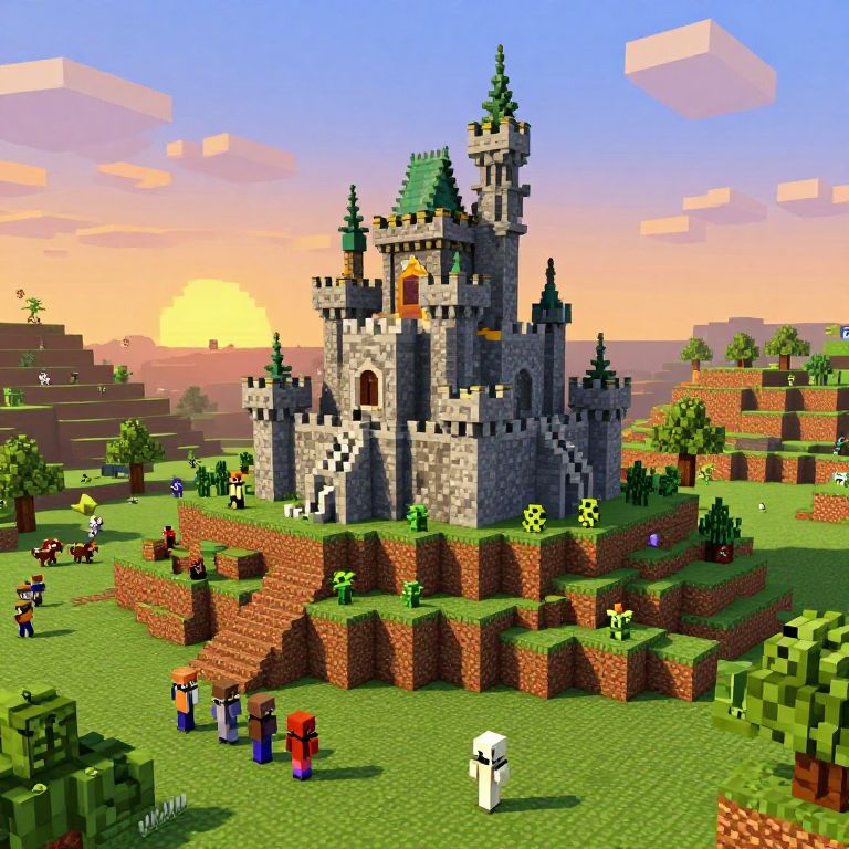 Minecraft stock images showcasing an epic pixelated castle build on a mountain, surrounded by blocky fields and a pixel art sunset, with villagers and creatures roaming, in a colorful, stylized Minecraft world with realistic shadows and vibrant colors.